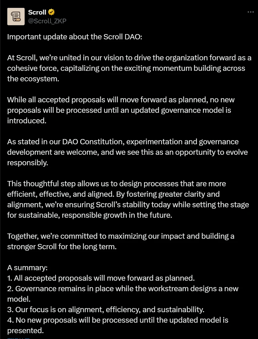 Scroll DAO宣布暂停接收新提案,持续推进已接受提案