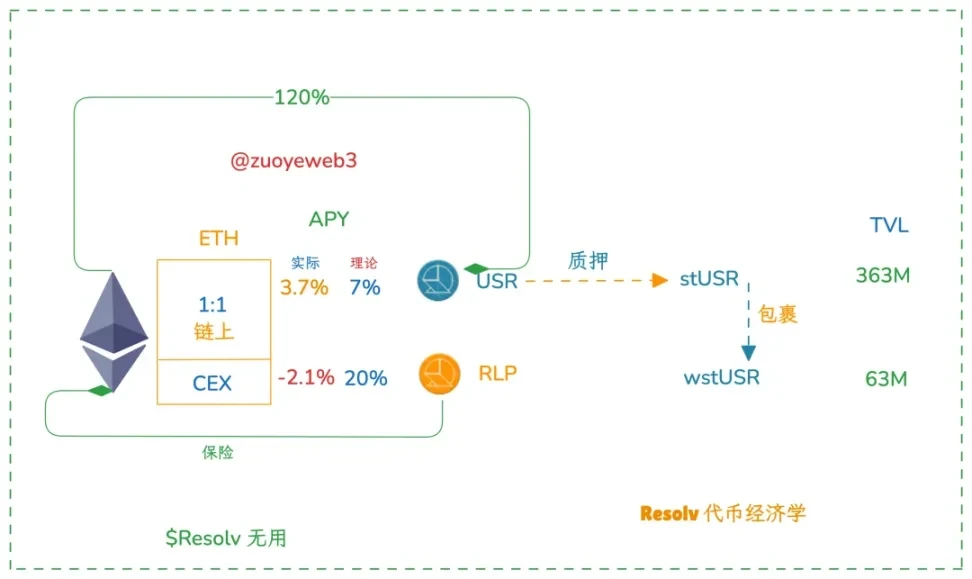 Resolv的USR与Ethena的USDe在稳定币设计上差异不大,但其创新点在于引入了RLP作为保险机制。由于无法完全摆脱对链下CEX和USDC的依赖,Resolv试图通过RLP将潜在负面影响最小化。