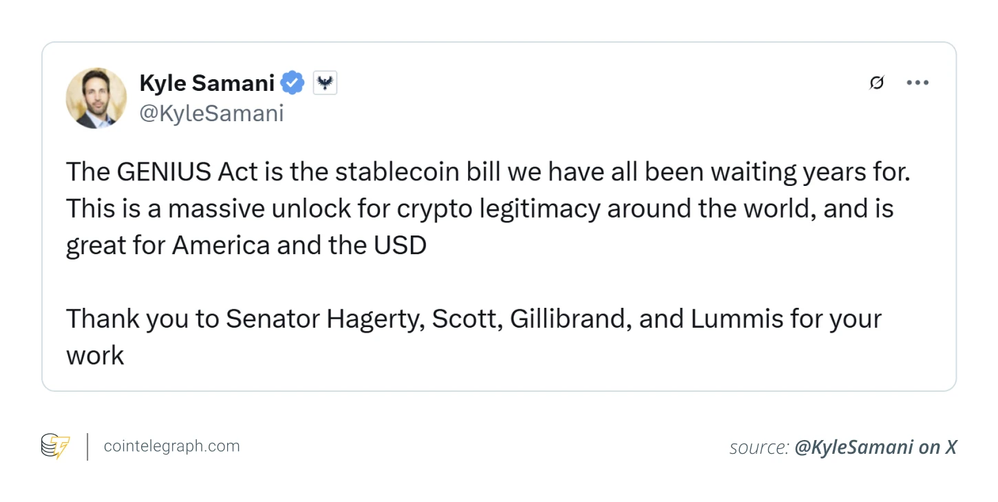 法案于2025年2月4日由参议员Bill Hagerty、Tim Scott等跨党派议员联合提出,仅一个月后的3月17日,参议院银行委员会便以18票赞成、6票反对的两党高票通过修订版本。,该法案已进入下一立法阶段,有望成为美国稳定币监管的重要里程碑。其快速推进与跨党派支持,反映了国会对平衡创新与风险的监管共识。