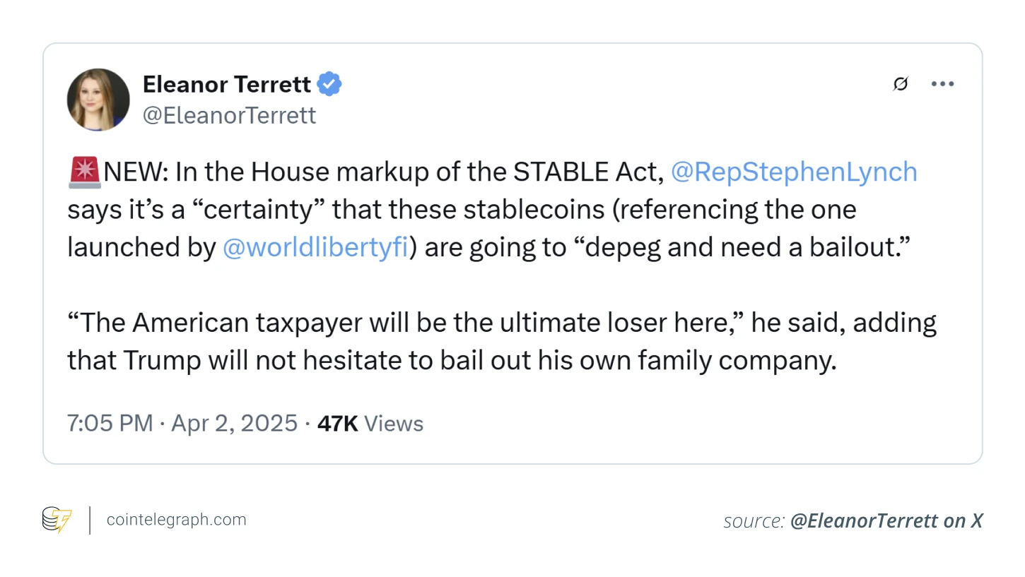 部分评论人士进一步警示,如果稳定币出现大规模脱锚风险,可能需要动用美国纳税人资金进行救助,引发公众对金融风险转嫁的担忧。