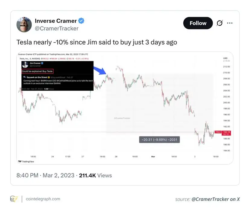 "反向Cramer法则"的流行并非偶然,其背后存在三大核心驱动因素。首先是历史误判的累积效应——Cramer多次做出与市场走势严重背离的预测,例如2008年力挺濒临破产的贝尔斯登,2022年加密货币暴跌期间看好Coinbase却遭遇股价持续下滑,这些标志性失误让投资者开始质疑其判断的可靠性。其次是立场反复的矛盾性,他的观点常随市场波动剧烈转变,如比特币从"糟糕投资"到"技术奇迹"的180度转弯,这种摇摆让交易者难以信任其长期逻辑。最后是社交媒体的推波助澜,X、Reddit等平台将其错误预测剪辑成模因,"反着Cramer操作"逐渐从戏谑调侃演变为散户群体的投资暗号,加速了这一法则的病毒式传播。