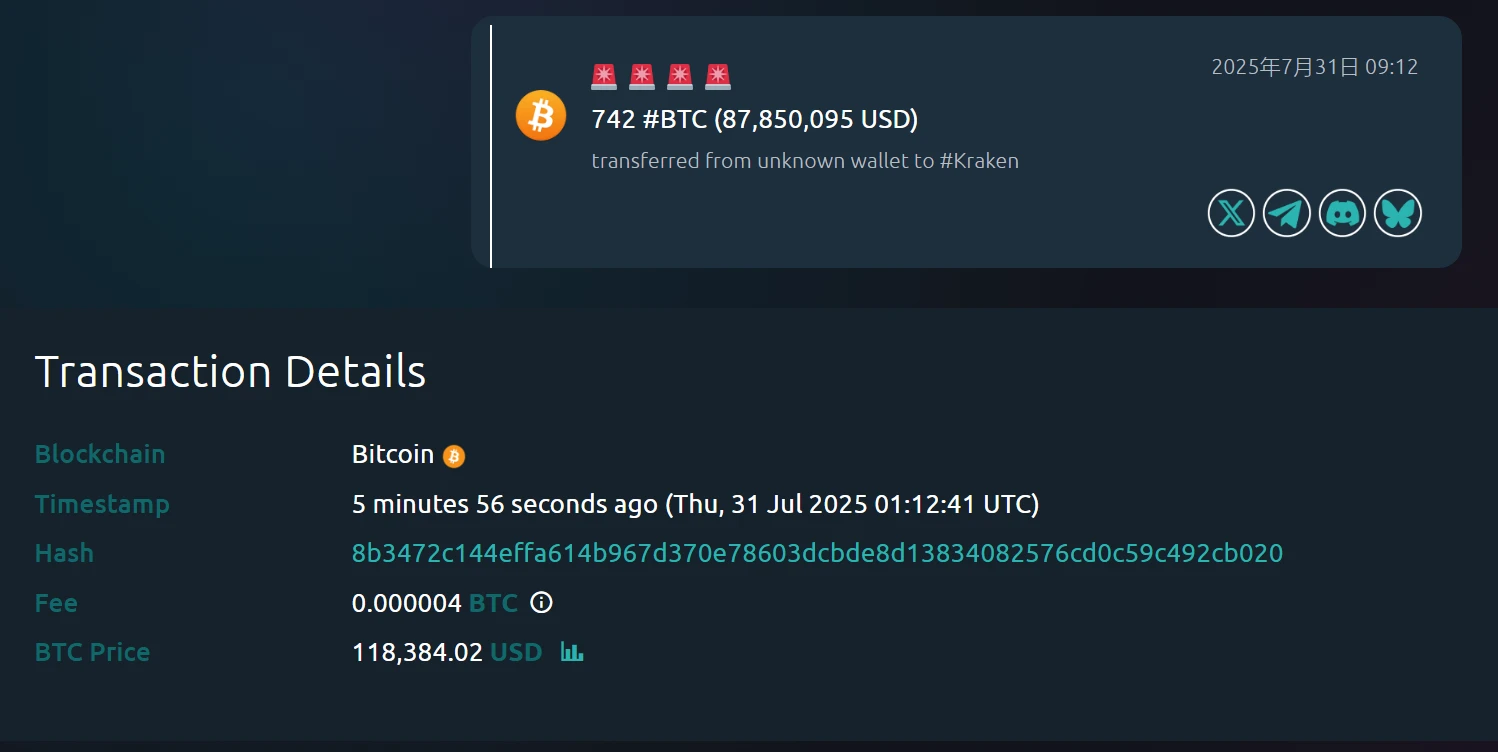 7月31日,Whale Alert监测显示,一个未知钱包向Kraken交易所转账742枚比特币,价值约8785万美元。