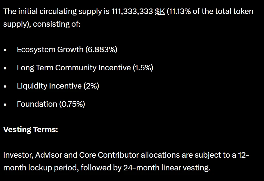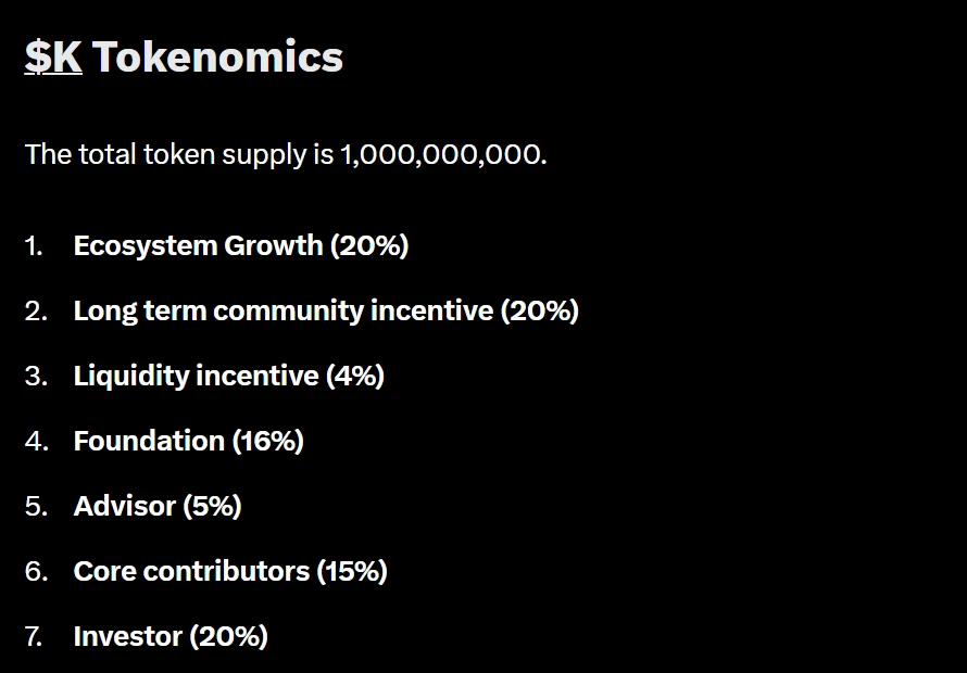 8月6日,直播交易平台Sidekick宣布成立Sidekick基金会并推出原生代币K,该代币将涵盖打赏、订阅、专属内容解锁及治理功能。K代币总供应量为10亿枚,初始流通量1.11亿枚(占总量11.13%)。代币分配方案显示:生态增长20%、长期社区激励20%、流动性激励4%、基金会16%、顾问5%、核心贡献者15%及投资人20%。投资人、顾问及核心贡献者所持代币将执行12个月锁仓期,之后24个月内线性解锁。