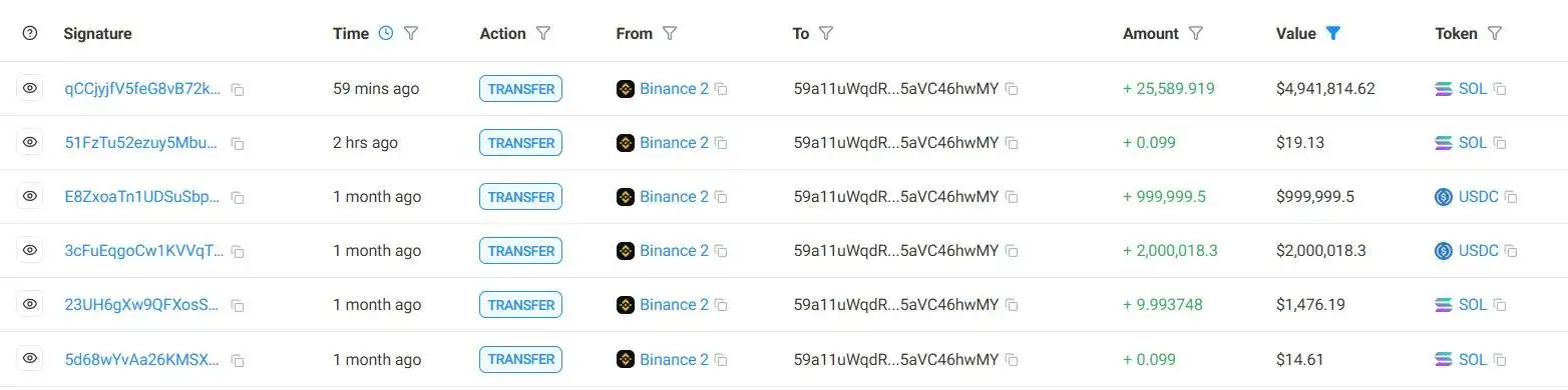 某鲸鱼地址8月15日从币安转出25,600枚SOL,价值约494万美元