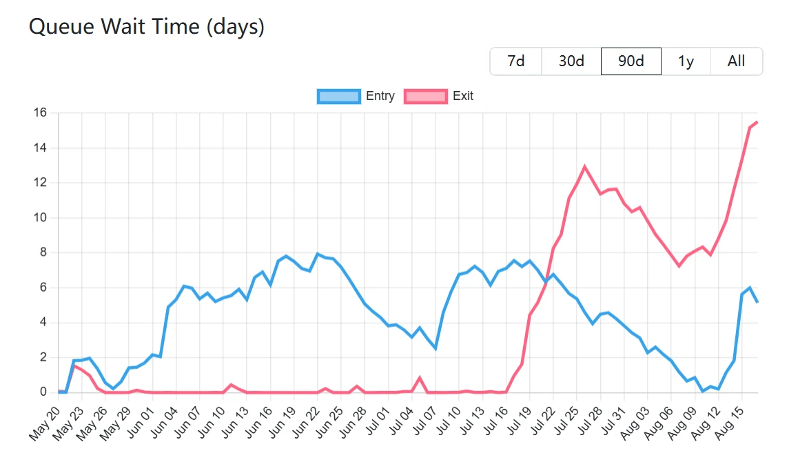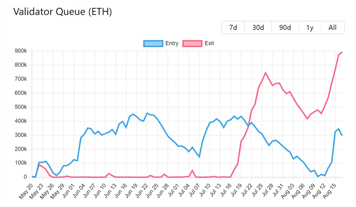 validatorqueue数据显示,截至8月18日,以太坊PoS网络ETH退出队列规模达872,893枚,对应市值约39亿美元,该队列数量已连续6日增长,当前退出等待周期为15天4小时;同期待激活的新增质押ETH数量为259,783枚,价值约11.6亿美元,预计需等待4天12小时完成激活。