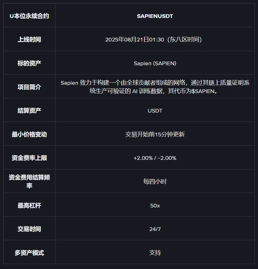 币安Alpha及合约平台宣布Sapien(SAPIEN)交易安排:现货交易将于2025年8月21日01:00(UTC+8)上线,永续合约交易同步于01:30(UTC+8)启动,支持最高50倍杠杆。作为首家上线该代币及合约产品的交易所,平台将面向符合条件的用户发放独家空投——用户需在2025年8月21日01:00至22日01:00期间,通过币安Alpha活动页面使用Alpha积分领取权益。