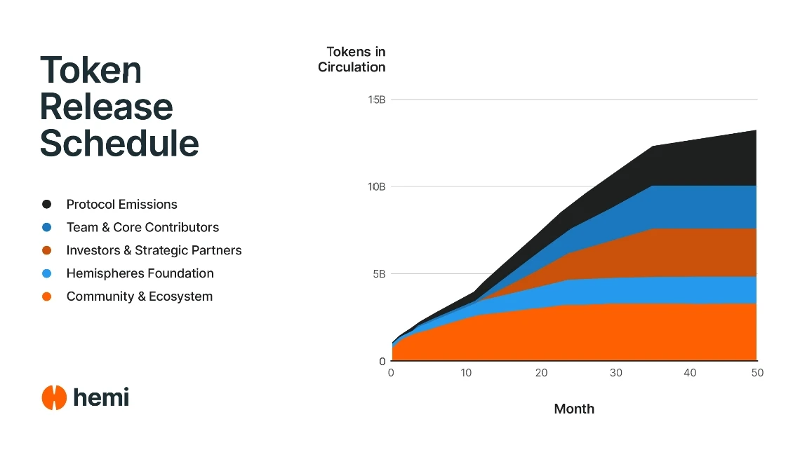 模块化L2区块链网络Hemi官方发布代币经济学框架显示,HEMI代币总量设定为100亿枚,分配结构为:团队及核心贡献者占25%;Hemispheres基金会占15%;社区及生态占32%;投资人及战略伙伴占28%。该网络运营方Hemi Labs曾于2024年9月完成1500万美元融资,由Binance Labs(现YZi Labs)等机构领投。
