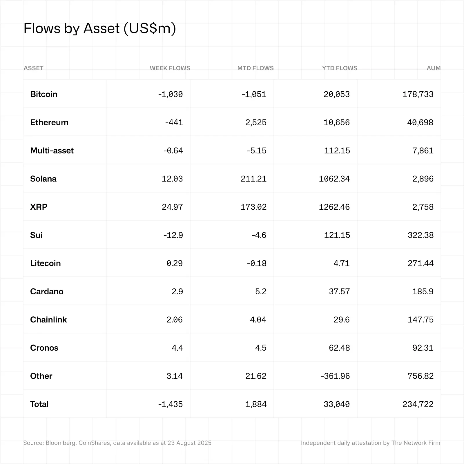 具体来看,BTC遭遇10亿美元净流出,Ethereum相对稳定,仅流出4.4亿美元。其他加密货币中,XRP、Solana及Cronos分别获2500万、1200万和440万美元流入,而Sui与Ton则分别净流出1290万及150万美元。