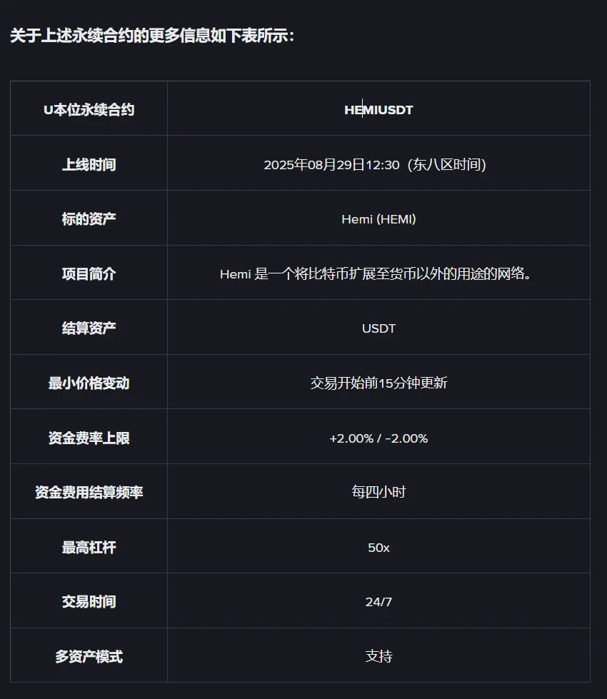 币安Alpha宣布Hemi (HEMI)交易将于2025年8月29日12:00(UTC+8)开放,币安合约平台同日12:30(UTC+8)上线HEMIUSDT永续合约,最高杠杆50倍。币安成为首个开放Hemi合约交易并展示该代币的平台。符合条件的用户可通过币安Alpha积分参与Booster活动获取空投,所获代币在TGE后进入锁定期,期间不可领取直至项目方解锁。用户需自行承担锁定风险、市场波动及项目风险,活动不承诺收益或流动性保障。