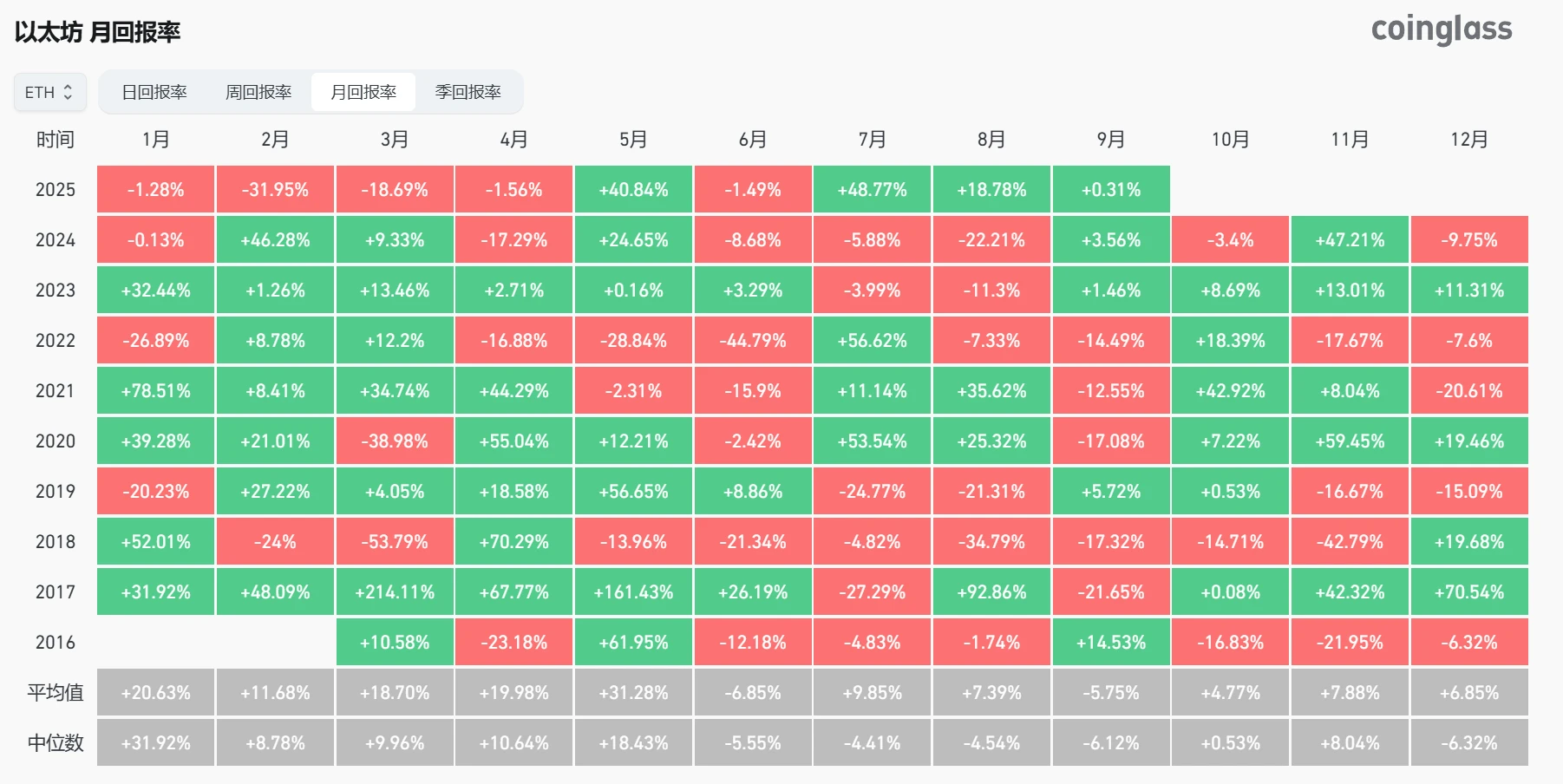 Coinglass数据显示,比特币和以太坊历史9月平均回报率分别为-3.55%和-5.75%(截至9月1日)。以太坊在过去9个9月周期中仅4次录得正收益(2016、2019、2023、2024),比特币在过往12个9月周期中同样仅有4次正收益记录(2015、2016、2023、2024)。