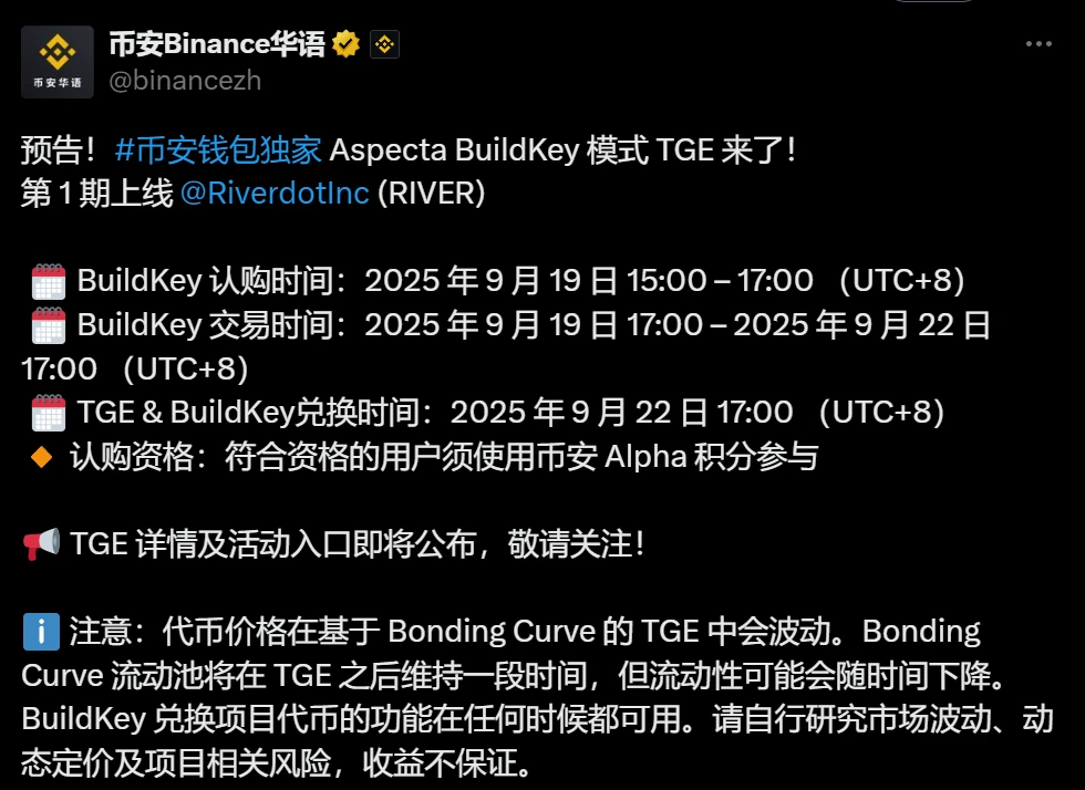 River官方披露BuildKey TGE参与规则,用户需持有至少209个Binance Alpha积分参与第一阶段BuildKey充值(扣除15积分),第二阶段BuildKey交易则需61点Alpha积分且不扣除积分。具体时间安排为:2025年9月19日15:00至17:00(UTC+8)开放BuildKey认购;交易窗口于当日17:00开启,持续至9月22日17:00(UTC+8);TGE及BuildKey兑换将于9月22日17:00(UTC+8)统一进行。