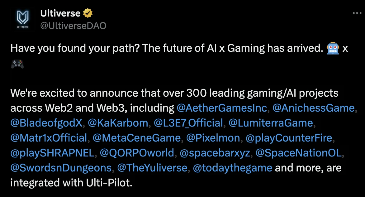 Ultiverse建立了广泛的合作伙伴网络,包括与Zetachain、Taiko等公链的合作,以及与Ainchess等游戏项目的联动。近期项目还宣布与多个Web2和Web3头部游戏团队达成战略合作,进一步强化其游戏平台定位。这种跨链、跨领域的合作网络为Ultiverse构建了独特的生态优势。