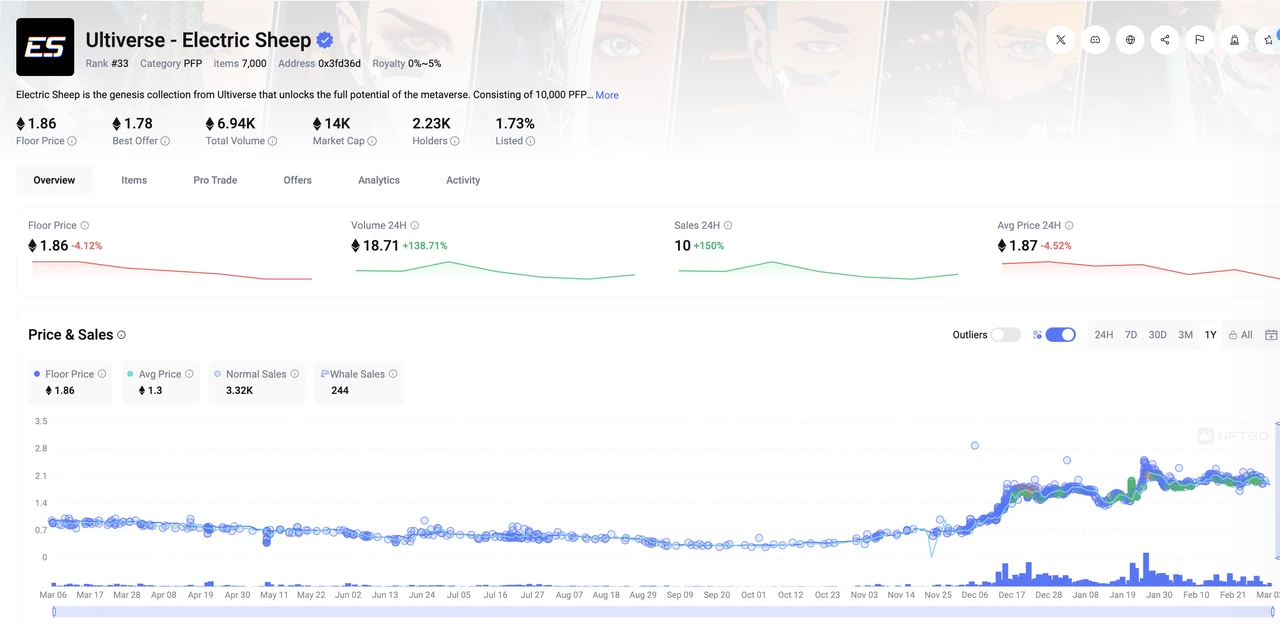 代币分配方案中,8%的ULTC将用于空投,覆盖Electric Sheep NFT、MetaGF NFT持有者以及Soul积分持有者等多个群体。当前Electric Sheep NFT地板价约2ETH,若按该NFT可获得2%代币计算,ULTC全流通市值约为23.8亿美元,与Binance上同类项目Portal的估值接近。