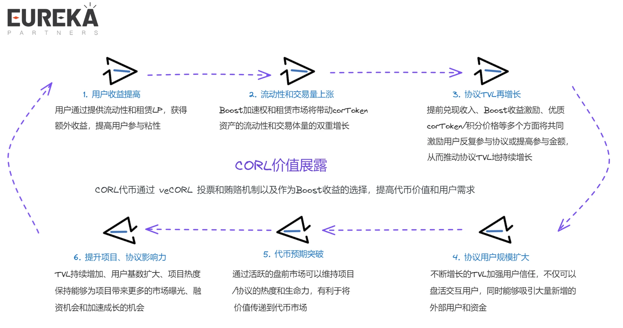 CORL代币通过精心设计的三重机制捕获协议价值:首先,用户可以通过锁仓获得veCORL,参与流动性奖励分配的治理投票;其次,项目方可以通过贿赂veCORL持有者来争取更多流动性奖励;最后,veCORL持有者根据投票结果获得交易费用、利息等多元收益。随着平台价值增长,CORL的市场需求将不断提升,推动其价值持续上涨。