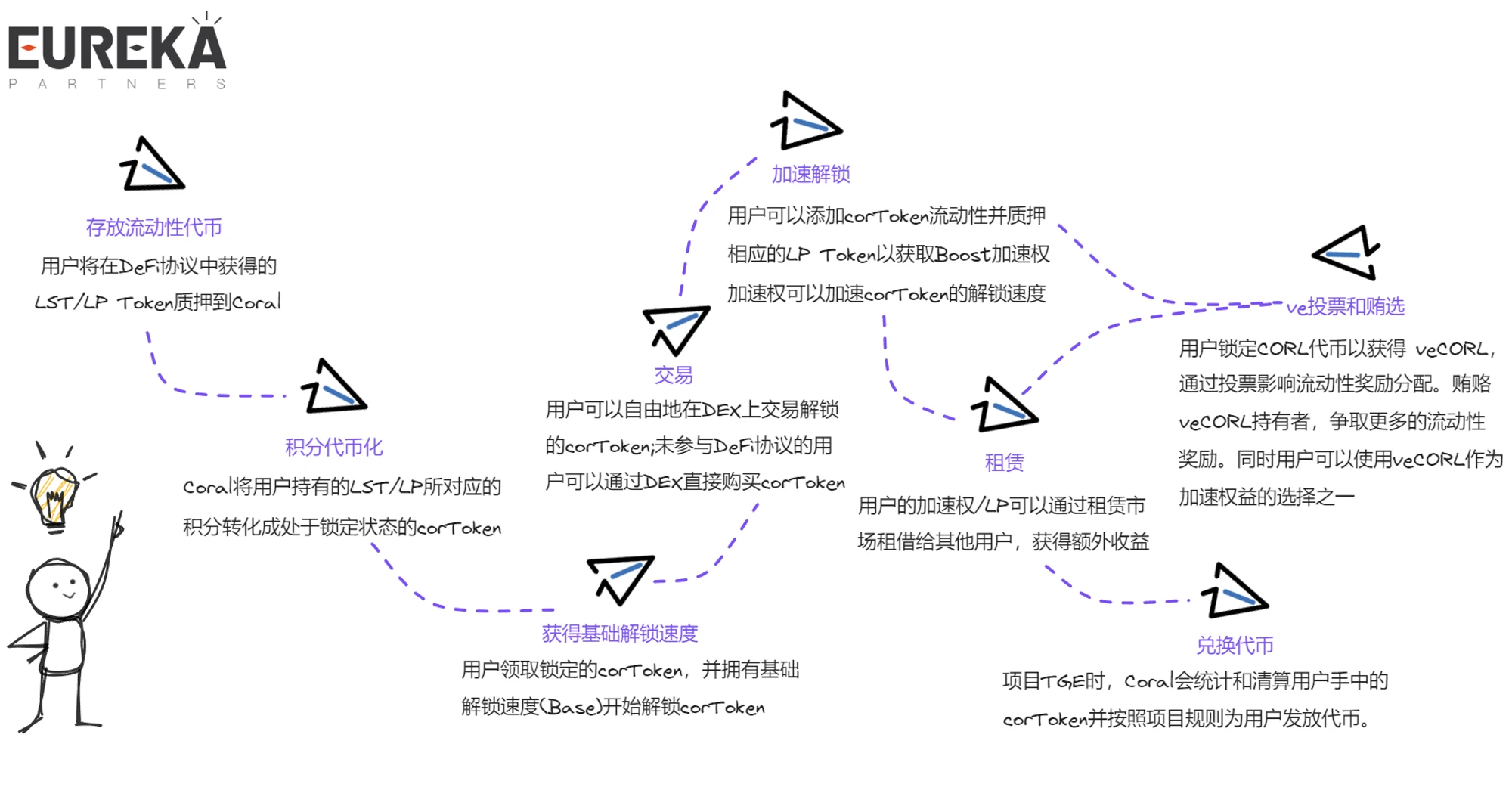 具体运作流程如下:用户将DeFi协议中的LST/LP Token质押到Coral后,系统会将其对应的积分转化为锁定状态的corToken。用户领取后即开始以基础速度解锁,已解锁部分可在DEX自由交易。用户还可通过添加corToken流动性并质押LP Token来获取加速权,加快解锁速度。这些加速权和LP Token可通过租赁市场租借给其他用户获取额外收益。当项目正式发行代币时,Coral会清算用户手中的corToken并按规则发放项目代币。
