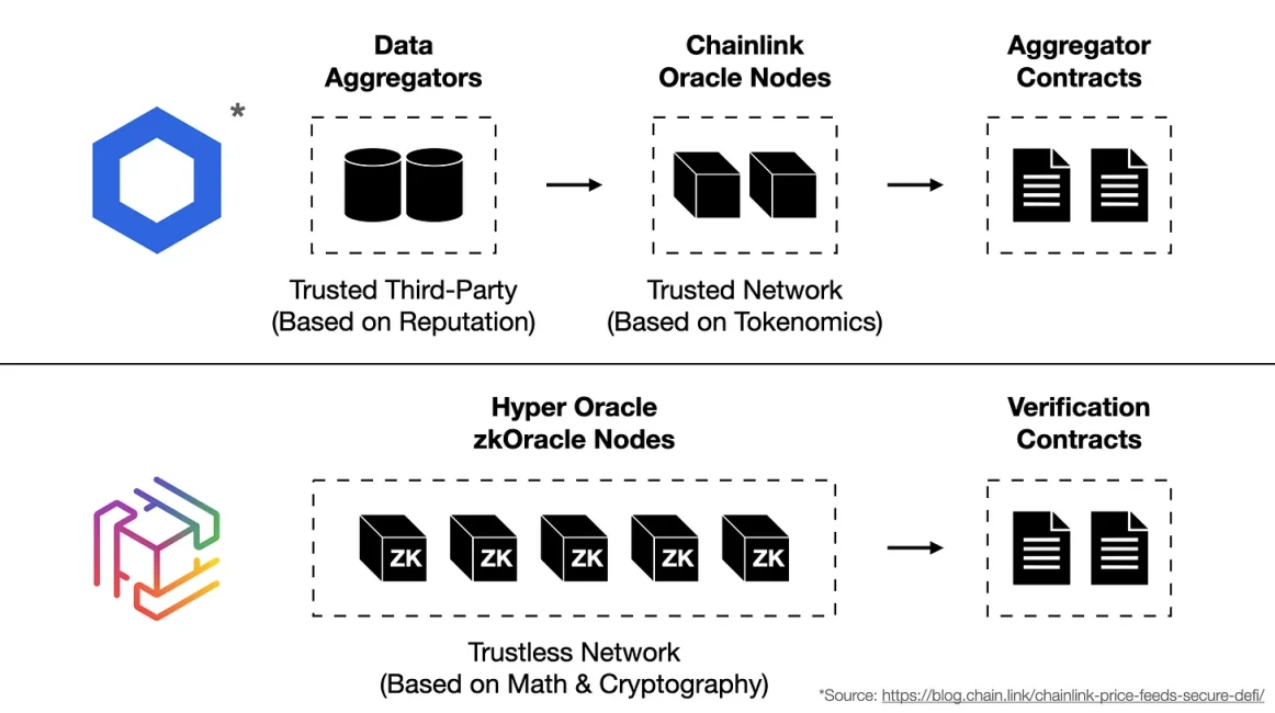 在预言机领域,HyperOracle与传统方案存在显著差异。zkOracle协议利用零知识证明在链下执行计算,提供安全且无需信任的操作环境,而传统预言机则依赖有限的智能合约计算能力,需要通过无信任聚合机制来确保数据可靠性。