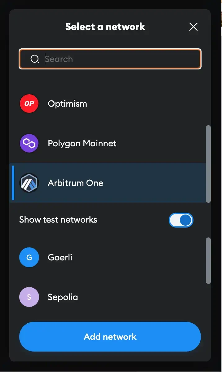 点击网络选择按钮中的"添加网络"选项,填写测试网参数后保存并切换至该网络。
