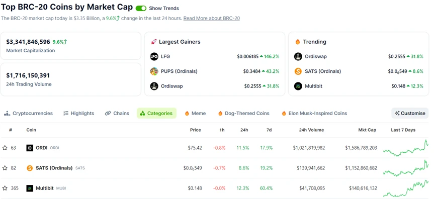 目前区块链铭文市场以BRC-20项目为主导。作为首个比特币铭文标准协议,BRC-20自2022年底由Ordi项目推出后迅速占领市场,形成了较为成熟的生态体系。2023年成为BRC20项目的全面繁荣期,以Ordi为代表的头部项目获得用户和资本的高度关注,其生态代币ORDI市值已进入前三十名。与此同时,大量仿制BRC20项目如雨后春笋般涌现,BRC20正快速获得市场认可,成为铭文领域的主流选择。