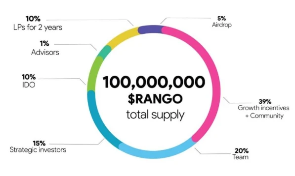 Rango的代币经济模型围绕$RANGO设计,旨在平衡生态激励与价值捕获。该代币总供应量为1亿枚,其中39%分配给社区基金和增长激励,10%用于流动性提供者奖励。团队和私募投资者分别持有20%和15%,均设置一年锁定期逐步释放。