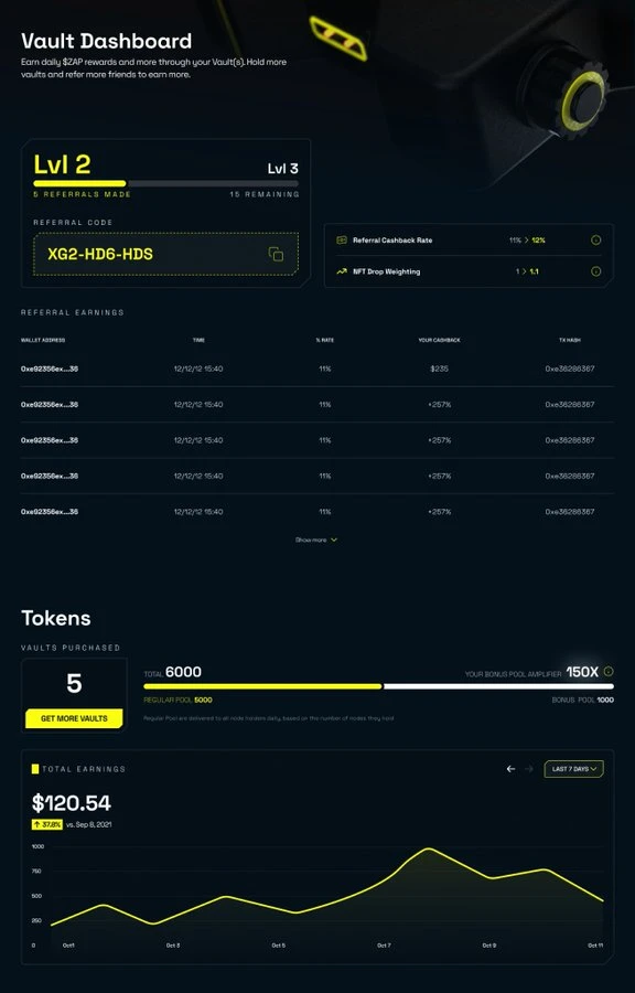 平台还设置了奖金池,占Vault供应量的20%。用户通过推荐新成员和增加Vault持有量可以获得更高权重,从而分得更多奖励。要获得资格必须至少持有1个Vault,这种设计有效激励了社区增长和长期参与。