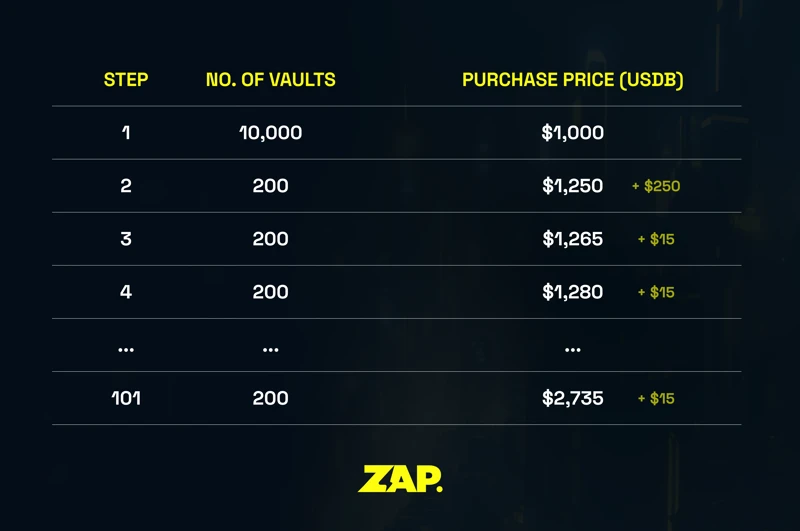 ZAP Vault采用阶梯式定价模式,前10,000个Vault定价为1,000美元USDB,随后每售出200个Vault价格将上涨15美元。在销售启动后的24小时内,平台就售出了超过10,000个Vault,筹集资金达1,000万美元。整个系统共发行30,000个Vault,为早期支持者创造了独特的价值捕获机会。