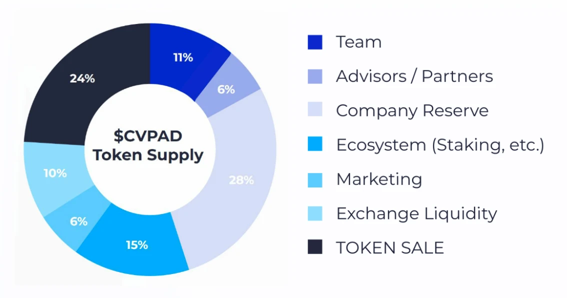 在代币经济模型方面,CVPAD代币总量为10亿枚,项目整体估值为2000万美元。代币生成事件(TGE)时的流通量为4725万枚,初始流通市值约为94.5万美元。募资方面,项目已完成种子轮和私募A/B轮融资,公募轮信息可通过官方渠道获取。
