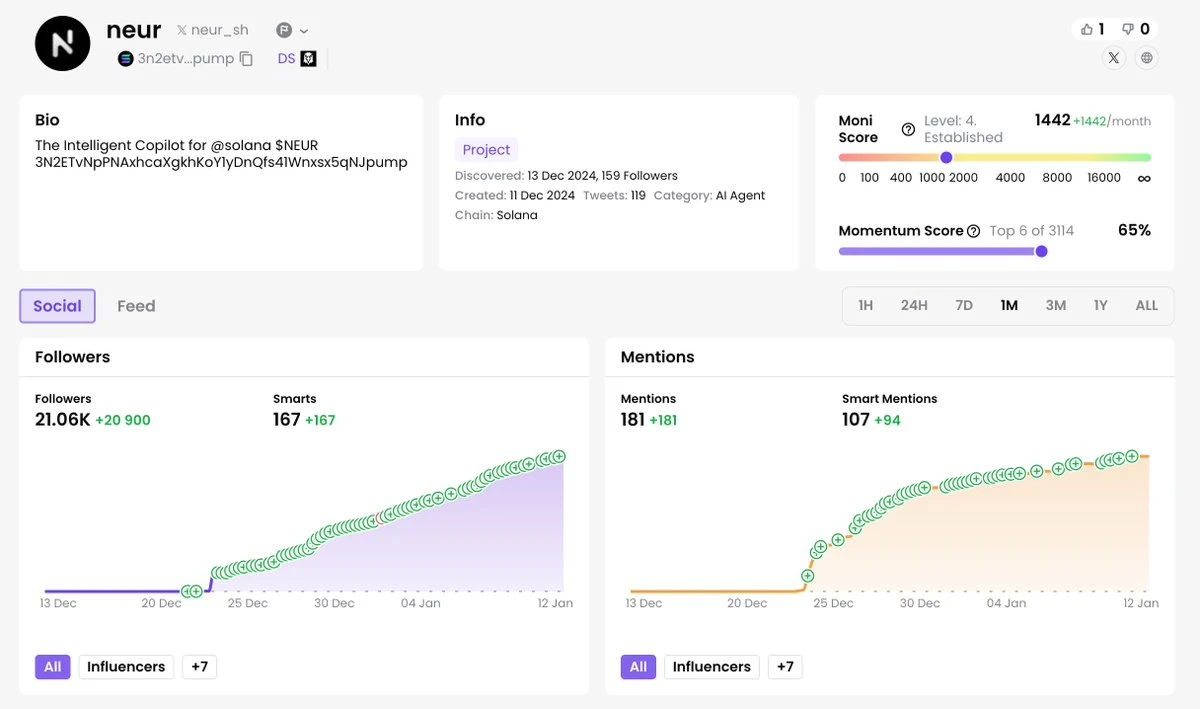 通过与Solana原生协议的深度集成,Neur能够连接Jupiter(DeFi交易)、Magic Eden(NFT交易)和DexScreener(市场分析)等关键平台。其智能代理系统通过直观的界面支持复杂的区块链操作,使数字资产管理变得更加高效。Neur在AI与区块链之间架起桥梁,让用户能够以更智能、更流畅的方式管理Solana资产。
