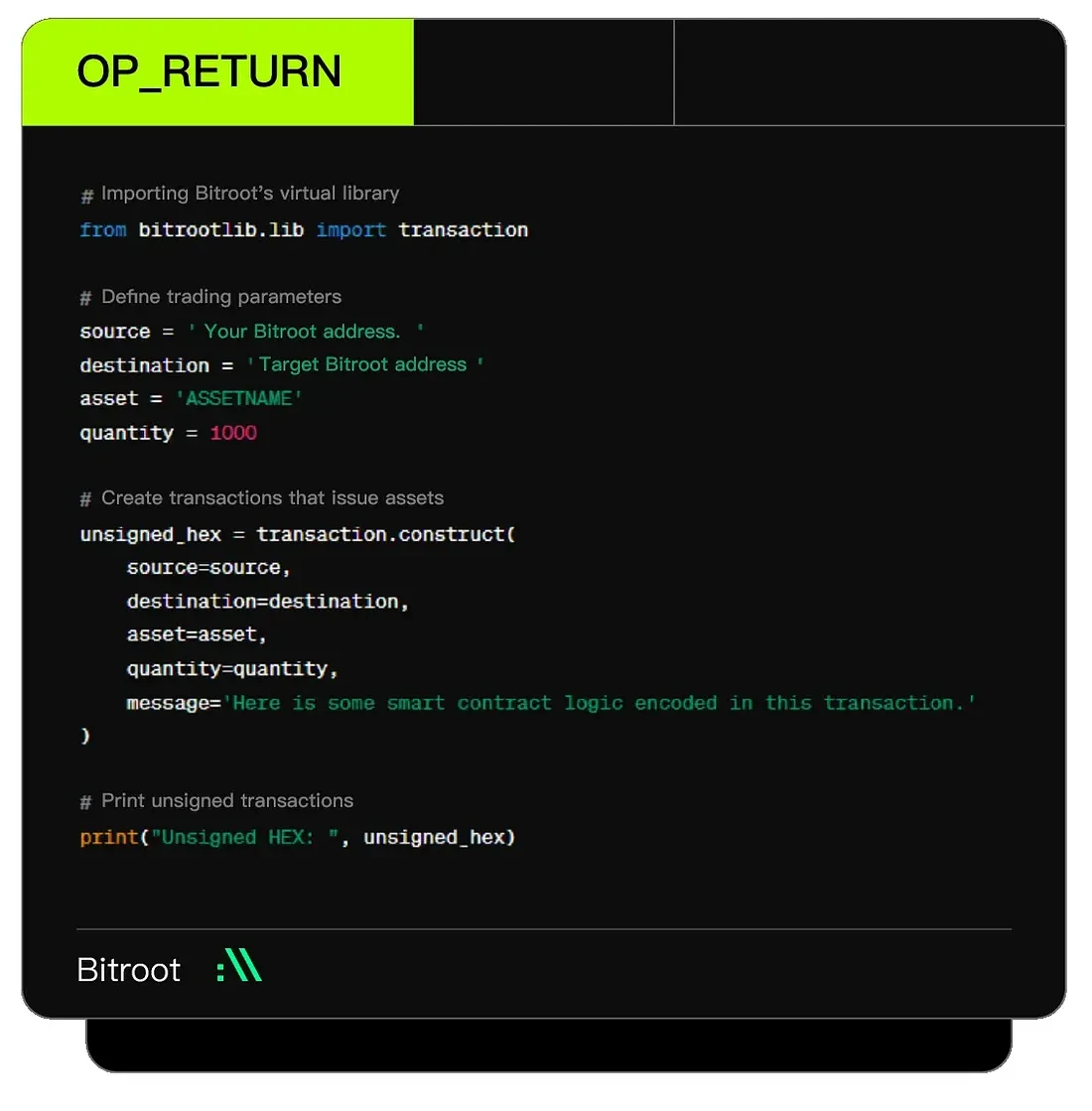Bitroot推出的BRT20协议为比特币链上资产发行带来了新的可能性。该协议选择在OP_RETURN中存储数据,通过bitcoinlib库创建包含OP_RETURN输出的比特币交易来实现资产发行和交易。与传统方式不同的是,Bitroot在OP_RETURN中不仅存入资产数据,还嵌入了智能合约逻辑。