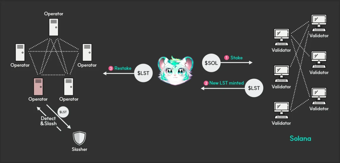 再质押是指通过质押已经质押过一次的资产(如流动性质押代币LST或jitoSOL)来增强特定去中心化服务安全性的过程。这个概念最初由EigenLayer提出,现在许多再质押协议已开始接受各类资产作为抵押品,而不仅限于LST。除了获得基础质押奖励外,用户还能通过再质押从去中心化服务中赚取额外收益。这种机制将Solana生态中的质押资产效用最大化,为网络安全性提供了额外保障层。
