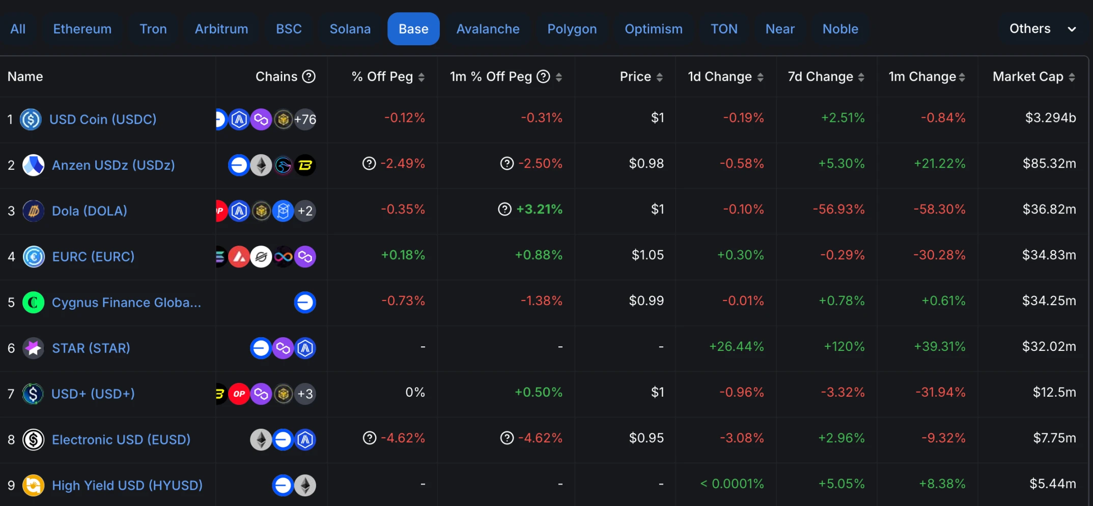 目前USDz已成为Base链第二大稳定币,TVL达到9000万美元,但仍远低于龙头USDC的33亿美元规模。ANZ代币市值约2000万美元,虽然从底部已上涨4倍,但整体规模仍较小。值得注意的是,Base链排名第三的稳定币DOLA历史上曾多次出现超过2%的脱锚情况,这反映出稳定币赛道的固有风险。