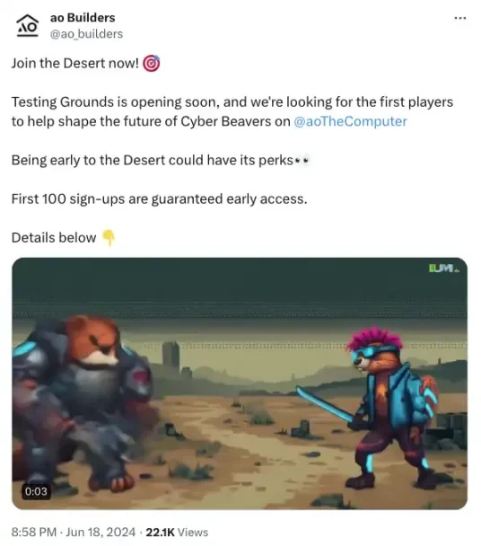 AO网络为计算密集型的完全链上游戏提供了理想的技术基础。目前已有多个游戏项目正在该平台上开发,例如LlamaLandAO和Cyber Beavers等项目正在探索这一新兴领域。