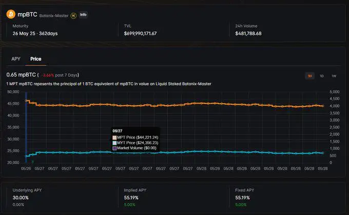 Master Protocol目前处于测试网阶段,已支持Botanix的mpBTC和Bouncebit的stBBTC(灰度测试中),未来计划接入Babylon、BitLayer等生息资产。测试网用户可通过水龙头申请mpBTC进行体验。该协议采用与Pendle类似的三元代币体系:MSY作为标准化生息资产包装代币,MPT代表本金部分并设有解锁期,MYT则对应利息部分可即时交易。