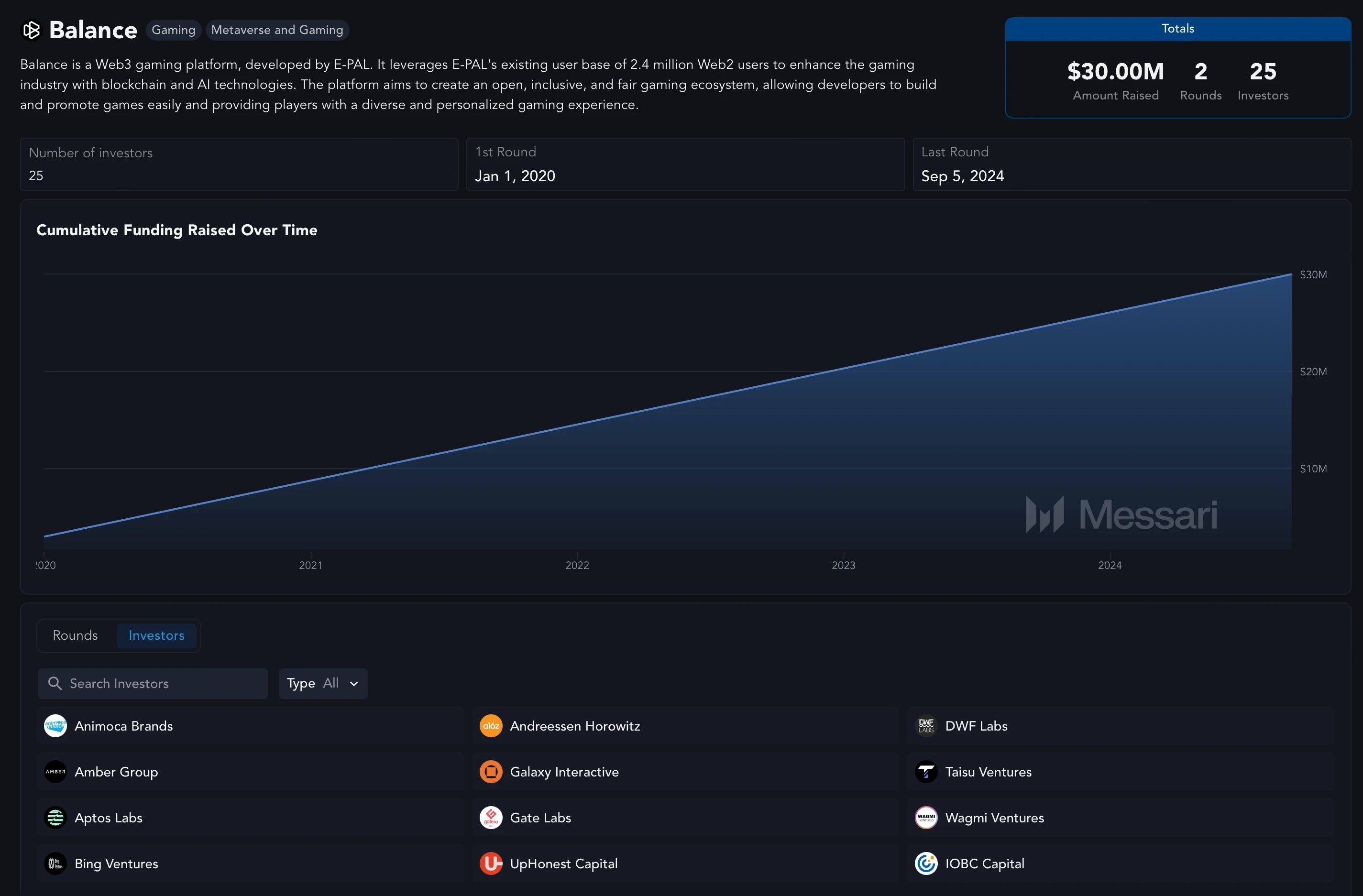 Balance是由E-PAL团队开发的Web3游戏平台,近期获得了3000万美元融资,投资方包括知名风投机构a16z和Animoca Brands。该平台致力于通过区块链和AI技术革新游戏行业,目前已积累240万Web2用户流量。