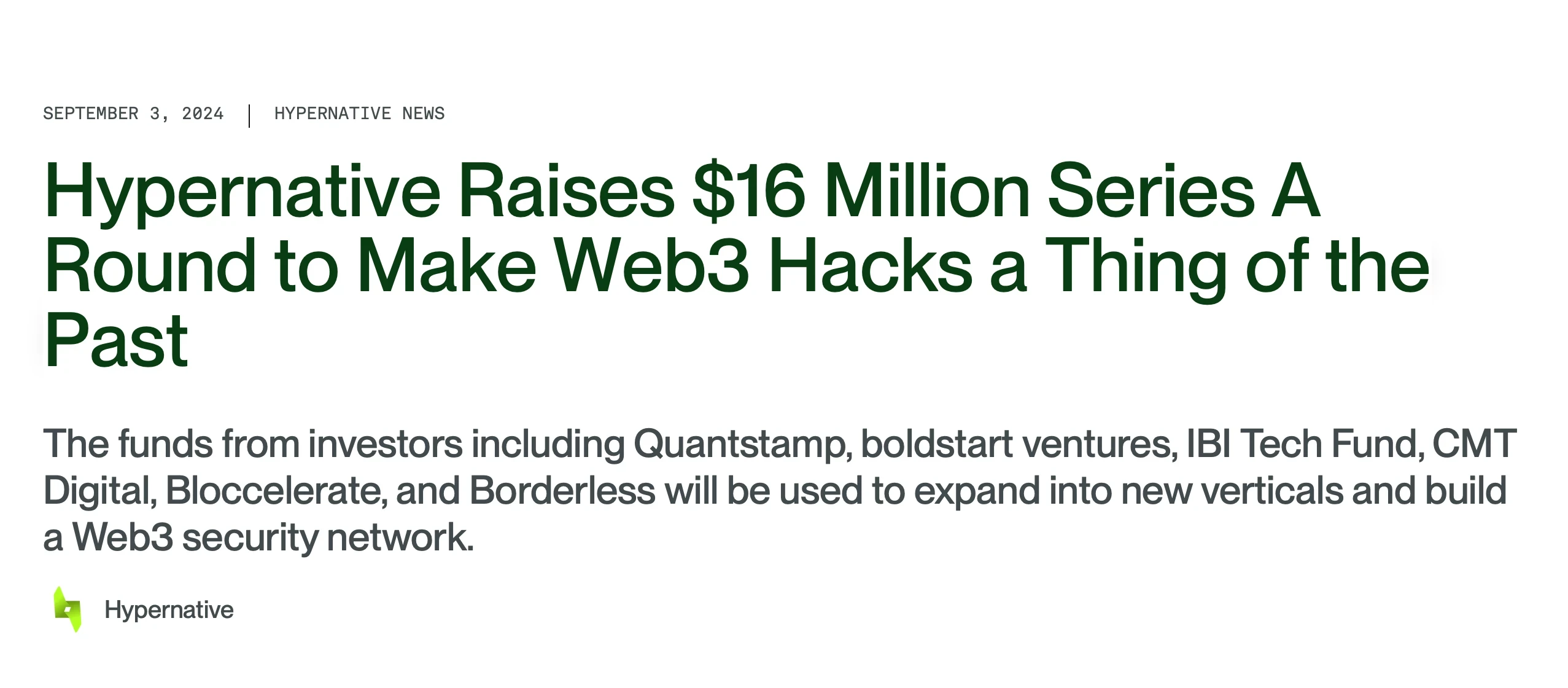 Hypernative在2024年9月完成了1600万美元的A轮融资,由Quantstamp、CMT Digital等知名投资机构领投。