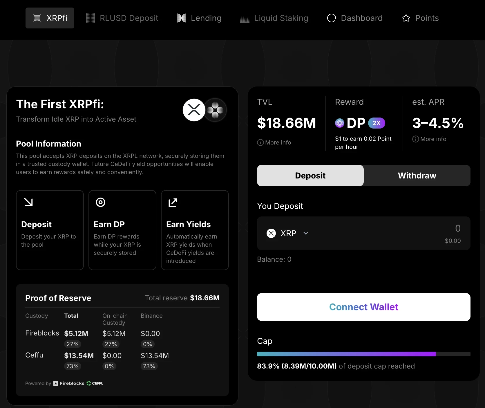 截至最近一次4月14日开放的第四批存款,Doppler Finance已累计吸引约839万枚XRP存入,对应总锁仓价值达到1673万美元。与静态持有XRP相比,存入该协议的用户可获得3-4.5%的动态年化收益率。这种通过侧链质押与借贷组合构建的复合收益模型,正在为XRP持有者创造前所未有的收益机会。