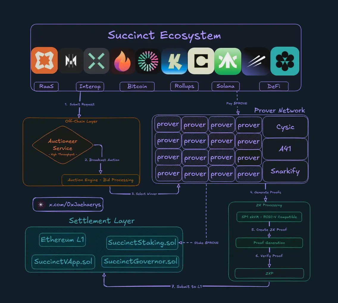 Succinct Prover Network 通过精心设计的市场结构实现高效的价格发现,将证明生成任务自动分配给最具竞争力的证明者。这套系统采用灵活的架构,能够适应不同用户的服务需求。