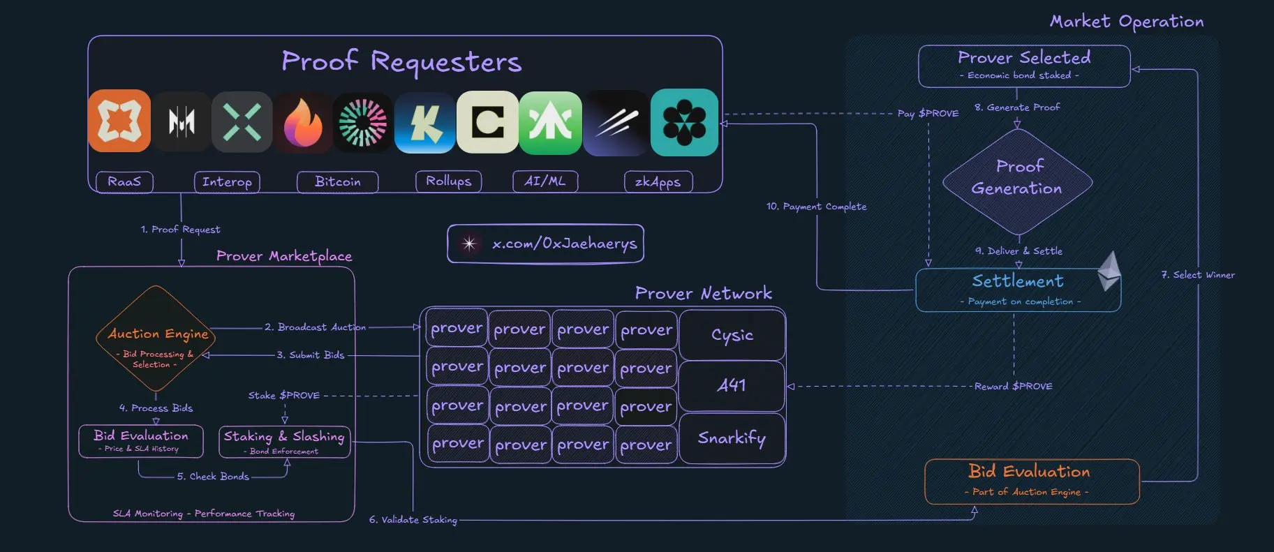 对于请求者来说,流程简单安全:他们先转账$PROVE支付费用,然后通过RPC调用发送证明请求,指定程序、截止日期和最高支付金额。链下拍卖服务会匹配最低价的合格证明者。证明完成后,交易会在以太坊上通过ZK证明结算,确保处理过程可验证。