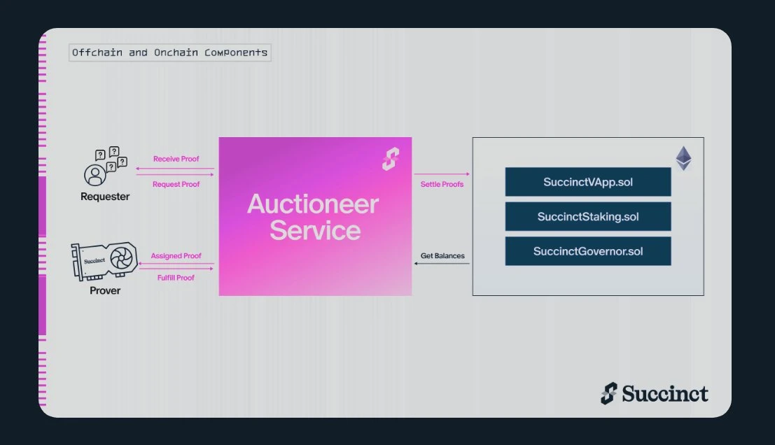 这种混合架构由两个主要组件支撑:链下拍卖服务负责快速匹配用户请求与证明者,通过RPC调用提供实时交互体验;链上结算合约则作为信任锚点,通过智能合约确保资金安全和状态验证。