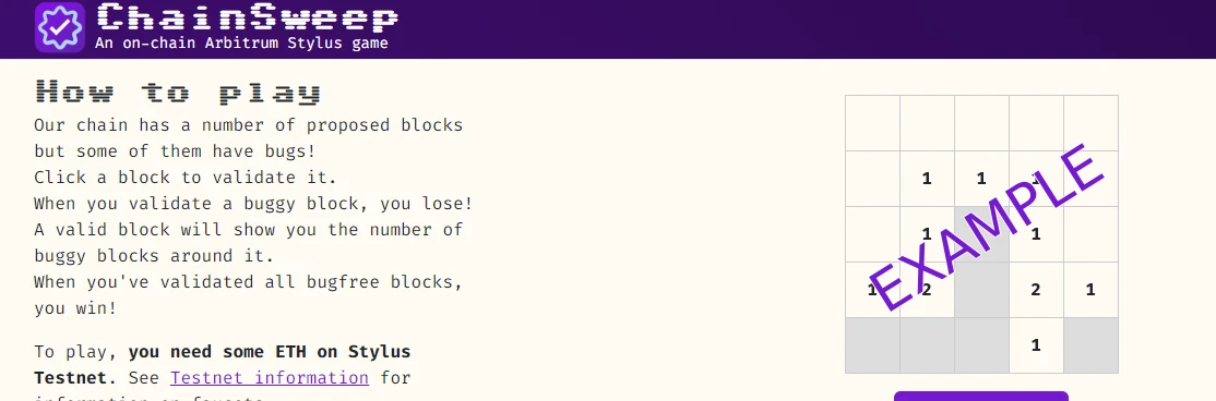 ChainSweep是一款基于区块链技术重新设计的扫雷游戏,运行在Arbitrum Stylus测试网上。与传统扫雷类似,玩家需要验证区块并避开包含错误的区块。