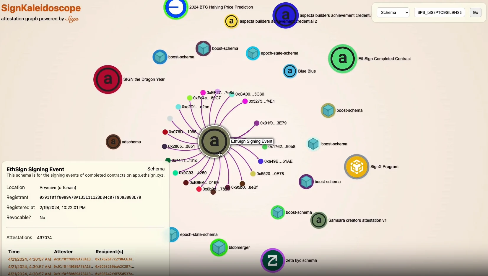 SignKaleidoscope是Sign协议的交互式可视化浏览器工具。它通过动态图形直观展示账户之间的签名关系和证明路径。用户可以通过点击图中的节点和连接线来探索不同账户的关联网络,也可以使用搜索功能直接定位特定账户。