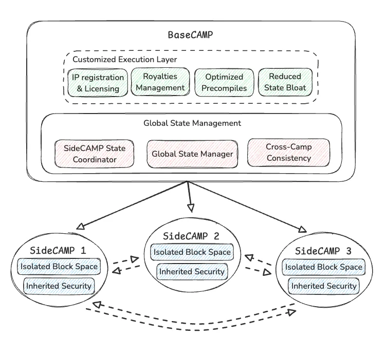 Camp Network构建了由BaseCAMP和SideCAMP组成的区块链基础设施。BaseCAMP作为全局状态管理器,集中记录所有网络活动,包括知识产权注册、使用和结算情况。这个系统专门针对知识产权交易进行了优化,不仅优先处理相关交易提高速度,还免除了用户支付Gas费的负担。