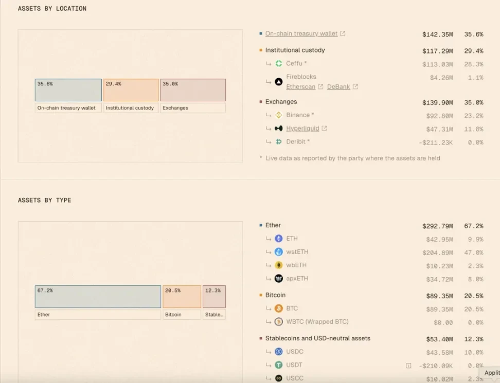 在资产配置方面,USR采用120%超额抵押机制,其中40%为链上资产。这部分抵押资产主要用于机构托管和链下CEX对冲。相比Ethena完全依赖链下CEX对冲的模式,Resolv的资本效率稍显不足,而RLP的设计正是为了弥补这部分收益差距,确保与Ethena保持竞争力。