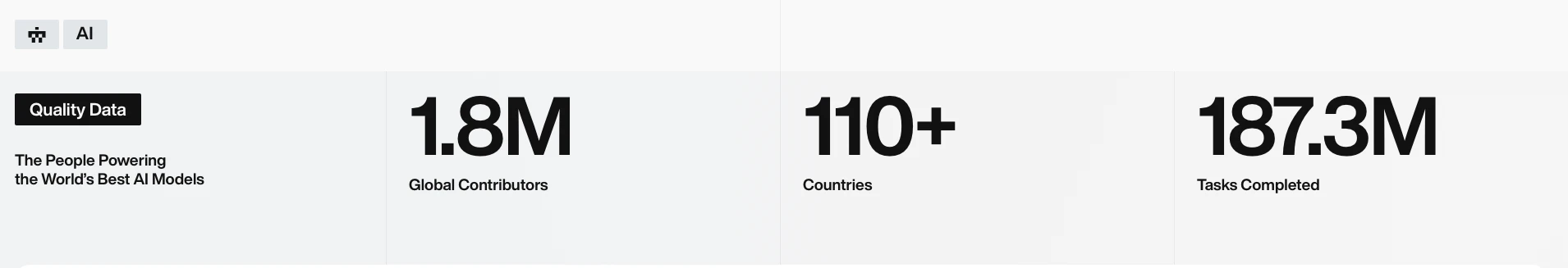 在商业化道路上,Sapien的进展远超同赛道其他项目,已经建立起覆盖全球110多个国家的庞大贡献者网络。根据官网最新数据,Sapien平台注册贡献者超过180万人,累计完成了1.87亿个数据标注任务。