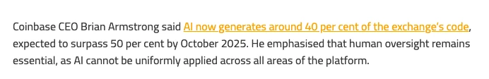 Coinbase的战略也在印证这一趋势。Coinbase CEO Brian Armstrong透露,Coinbase中40%的代码已由AI生成,目标是在2025年10月前达到50%以上。这种内部应用与外部趋势结合的双轮驱动,为Base生态AI项目提供了的战略和资源支持。